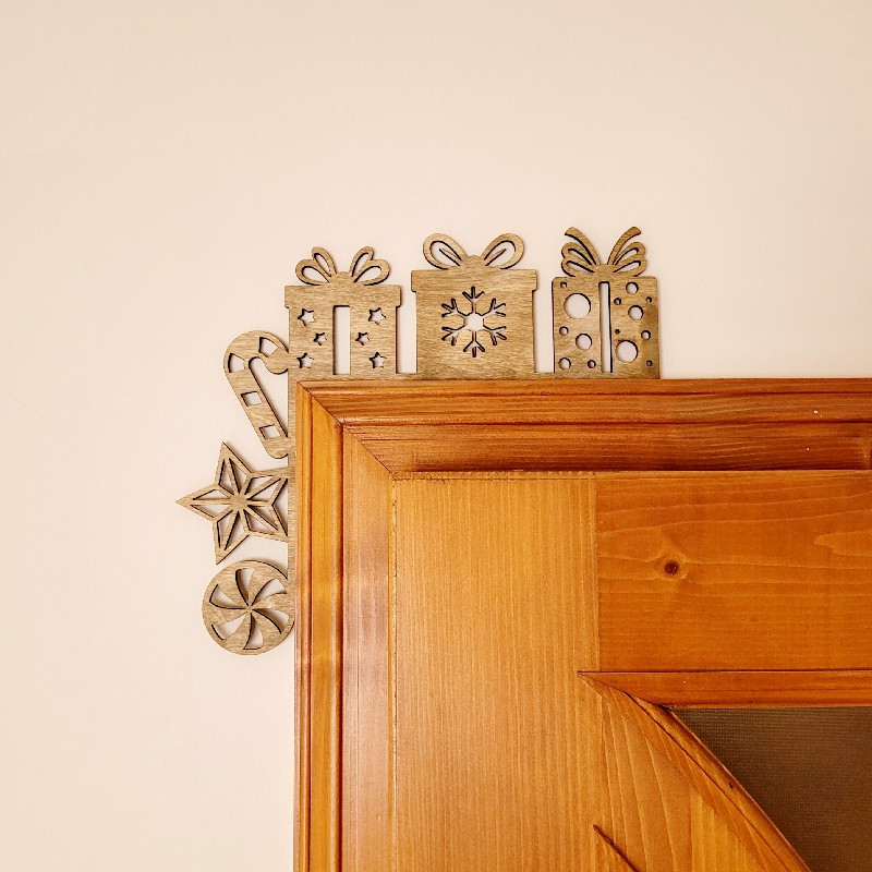 Ajándékdobozos dekoráció, ami az ajtófélfa jobb- és baloldalára is helyezhető.