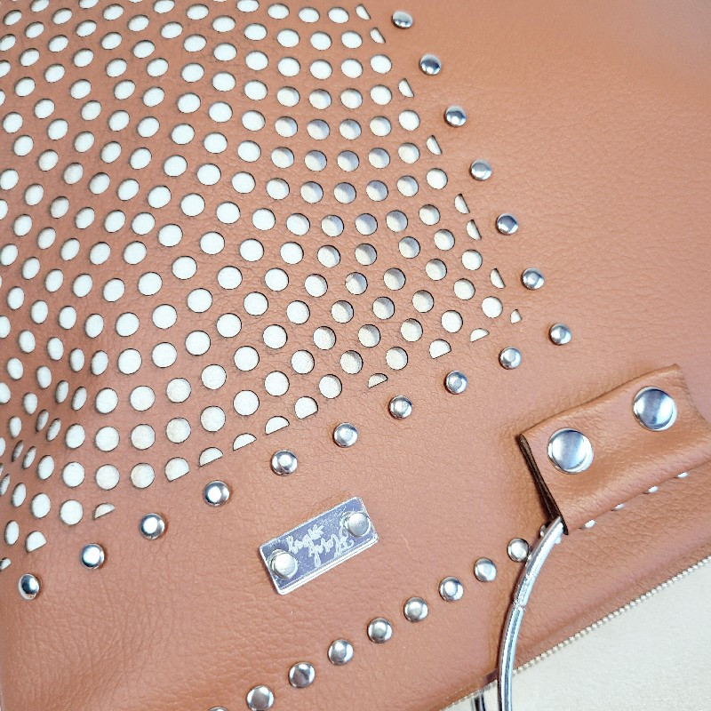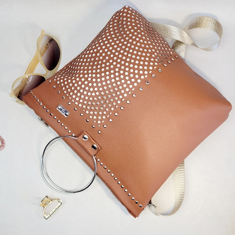 Színe camel (tevebarna) és bézs, mérete: 30 x 25 cm, kézi fogó karika 10 cm, állítható pánt 75-135 cm.