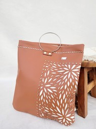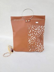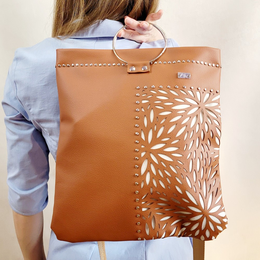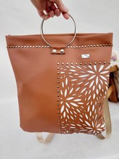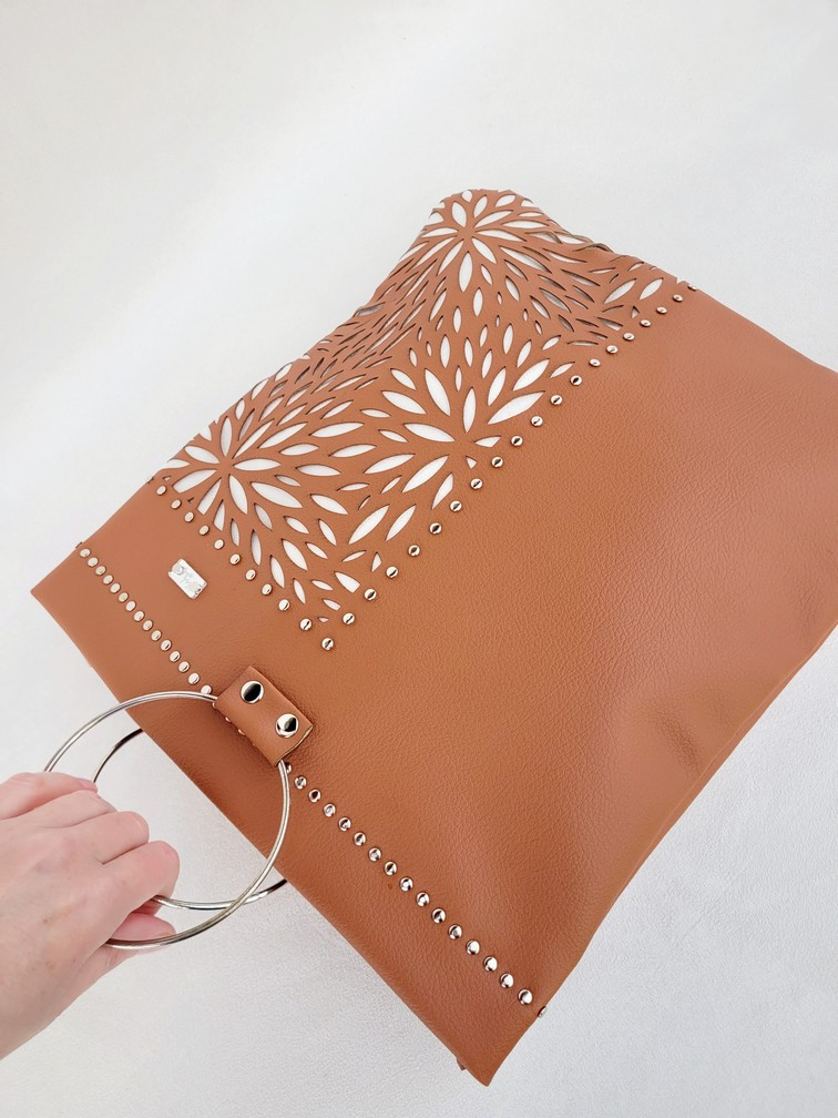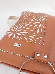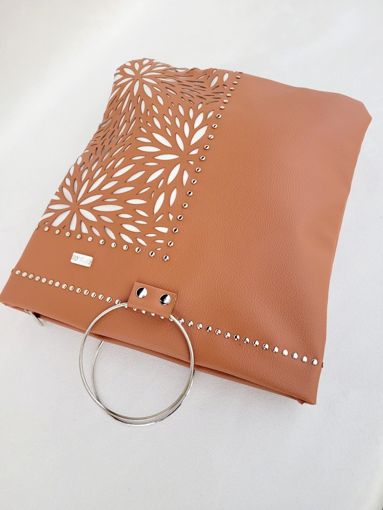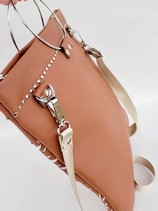 Színe camel (teveszín) és bézs, mérete: 32 x 35 cm, kézi fogó karika 10 cm, állítható pánt 70-130 cm.