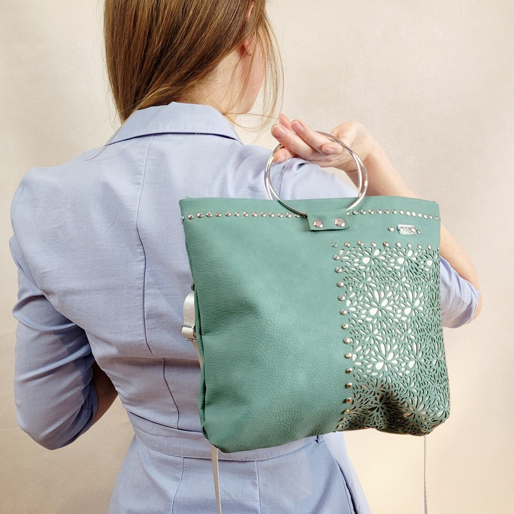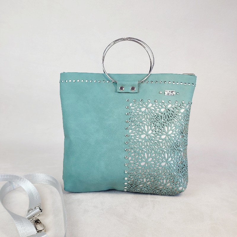 Színe és anyaga: mentazöld színű, kiváló minőségű textilbőr, a lézervágott minta alatt ezüst textilbőr.