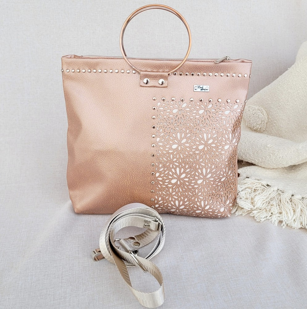 Színe és anyaga: fémes hatású réz színű, kiváló minőségű textilbőr, a lézervágott minta alatt bézs textilbőr.