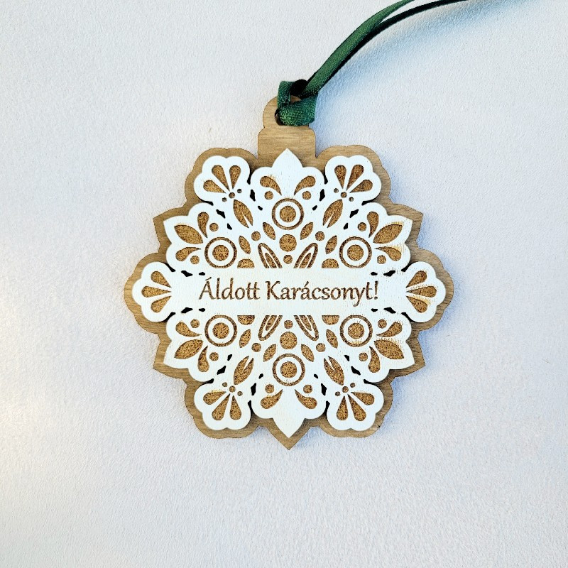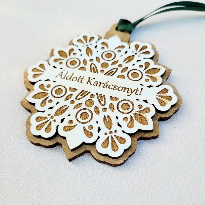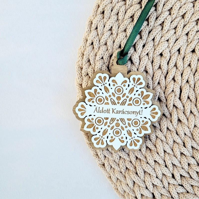 Varázsolj különlegességet az ünnepi hangulatba ezzel az elegáns, dió páccal kezelt, fehér rátéttel díszített fa karácsonyfadísszel! Legyen szó ajándékról vagy saját otthonod díszítéséről, ezzel az egyedi gravírozású darabbal garantáltan emlékezetessé teheted a karácsonyi pillanatokat. Minden egyes díszt személyre szabott felirattal kérhetsz – így igazán különleges lesz!
