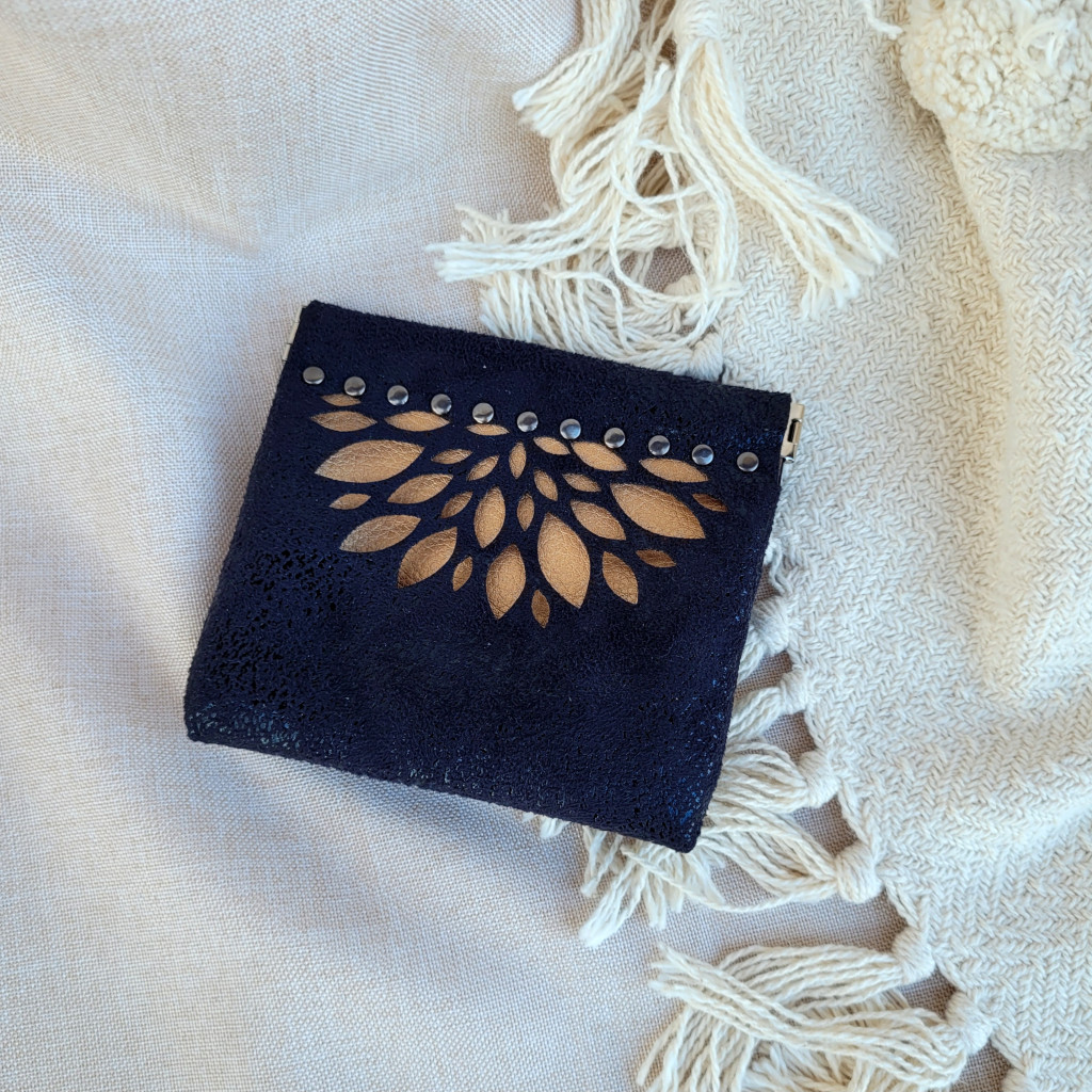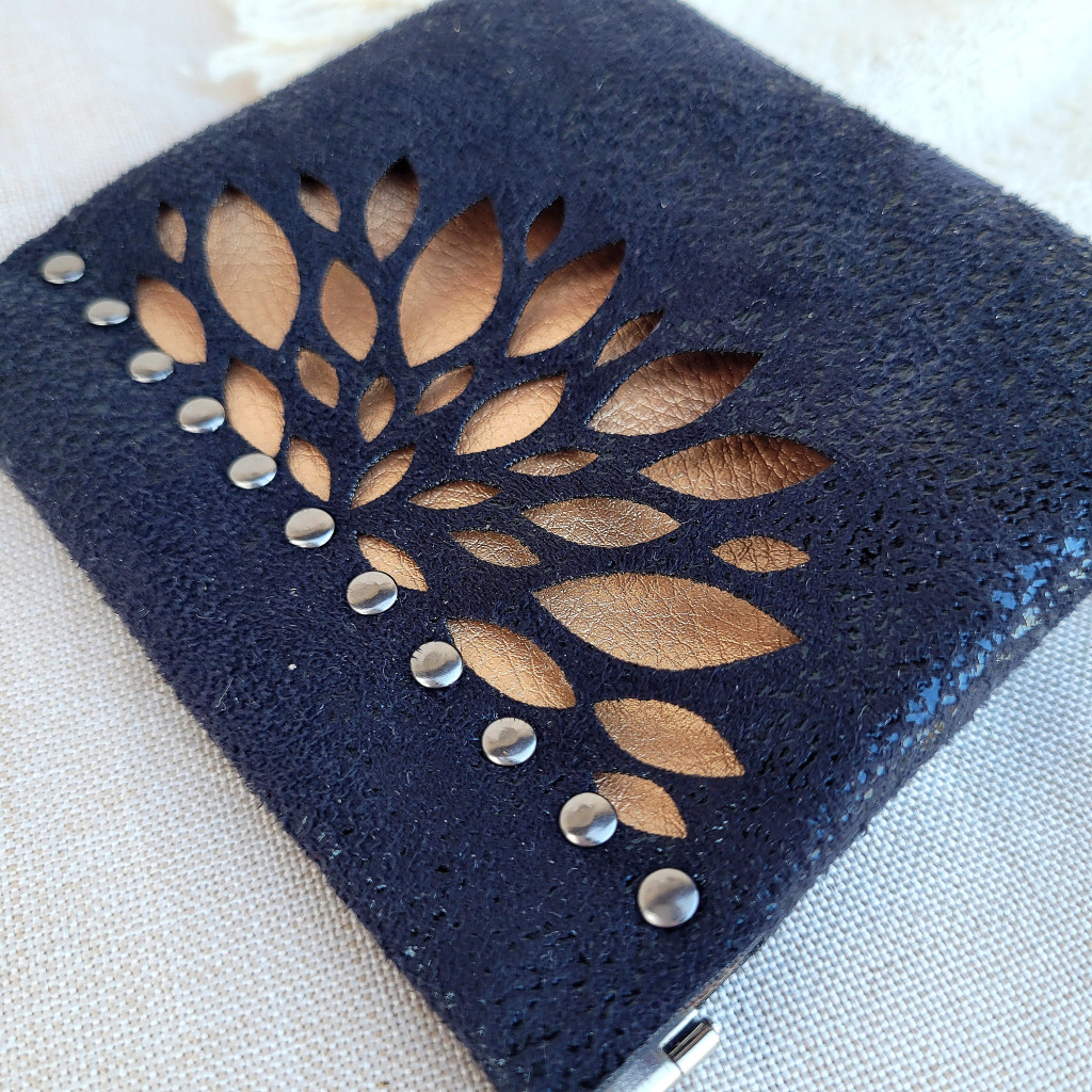 A puha textilbőr lézervágott mintával díszített, pattintós zárral egy mozdulattal nyitható és csukható.