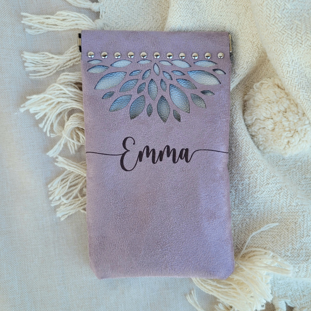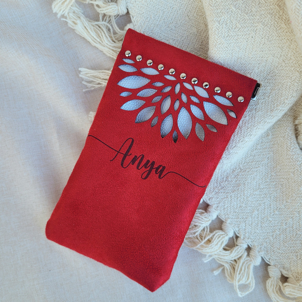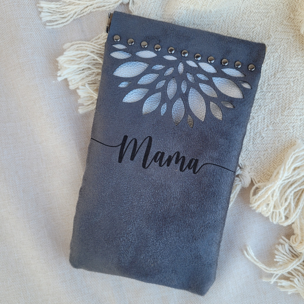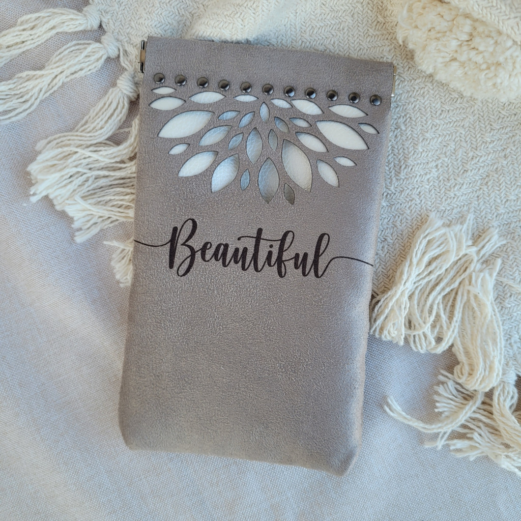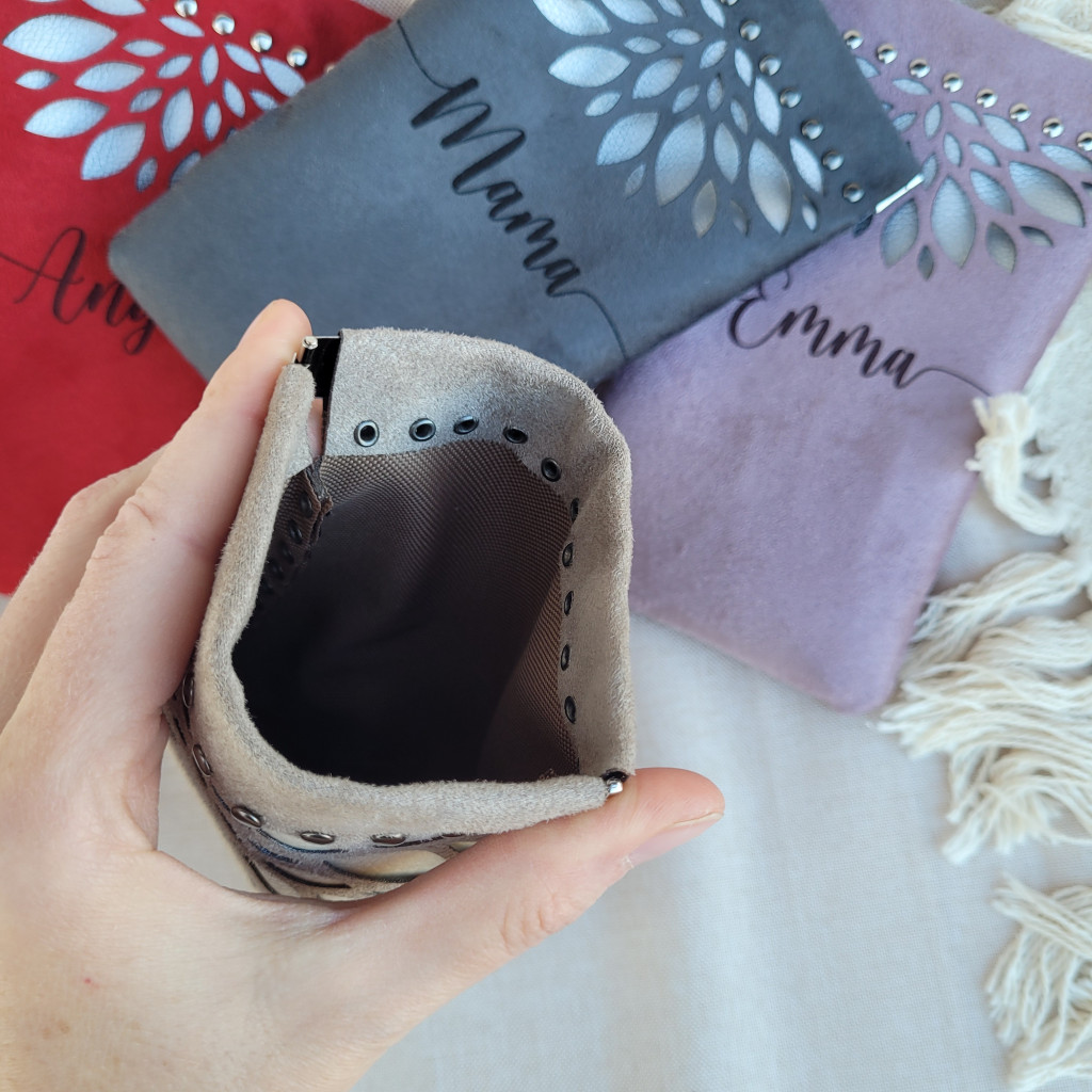 A puha textilbőr lézervágott mintával díszített, pattintós zárral egy mozdulattal nyitható és csukható.