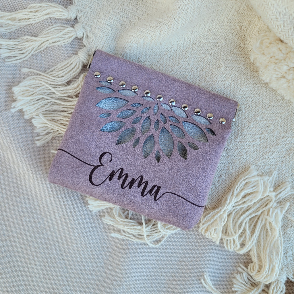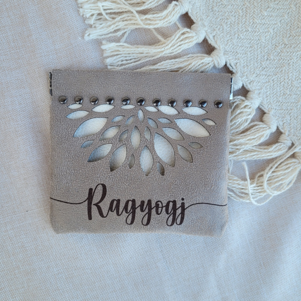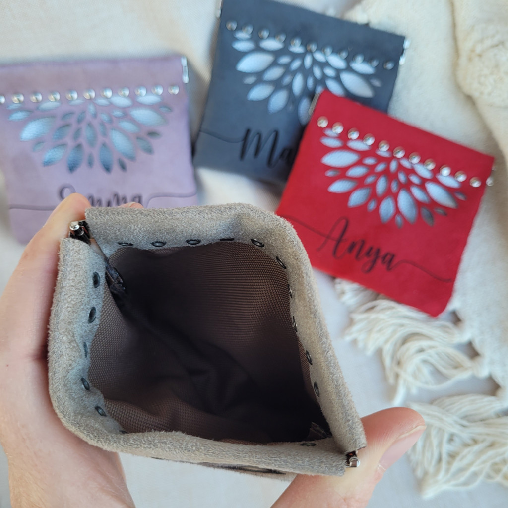 A puha textilbőr lézervágott mintával díszített, pattintós zárral egy mozdulattal nyitható és csukható.