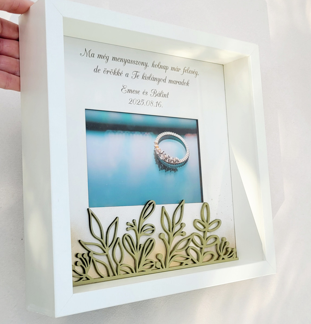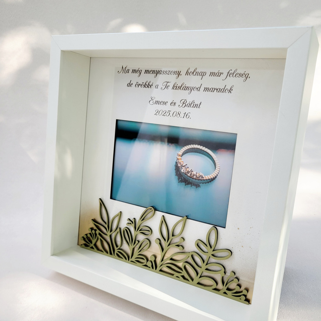 A keret szélessége 25x25 cm, vastagsága 6 cm. A képkeretbe 10x15 cm-es képet helyezhetsz.