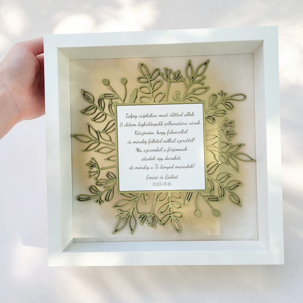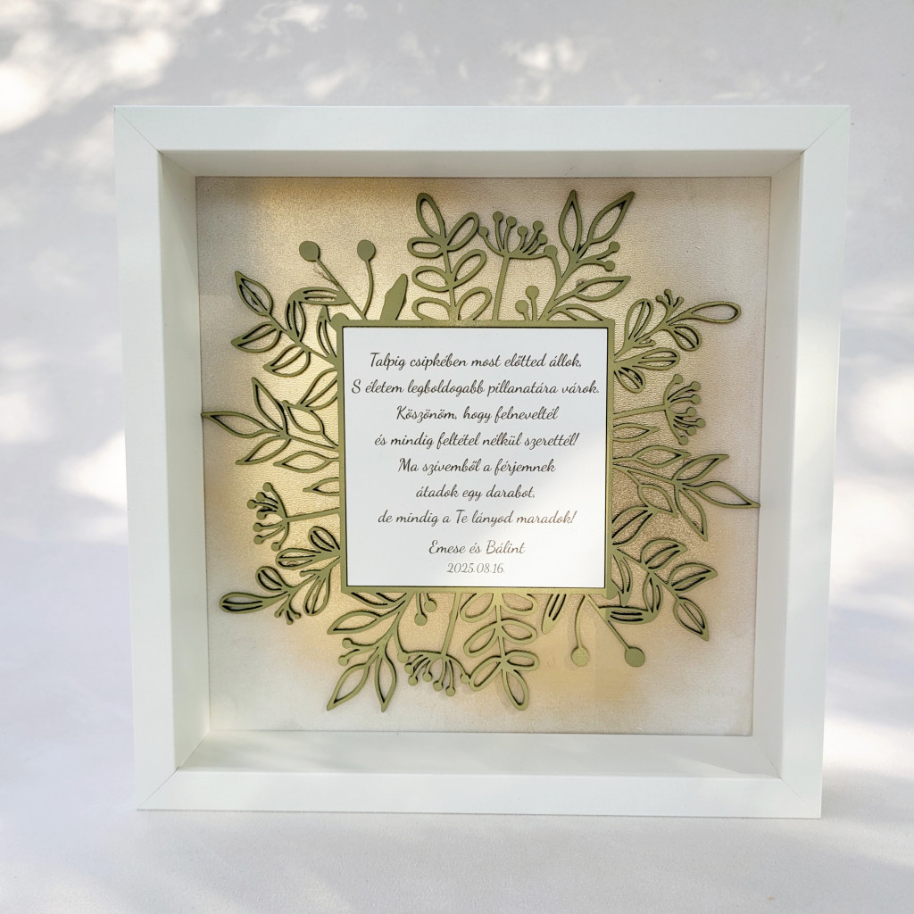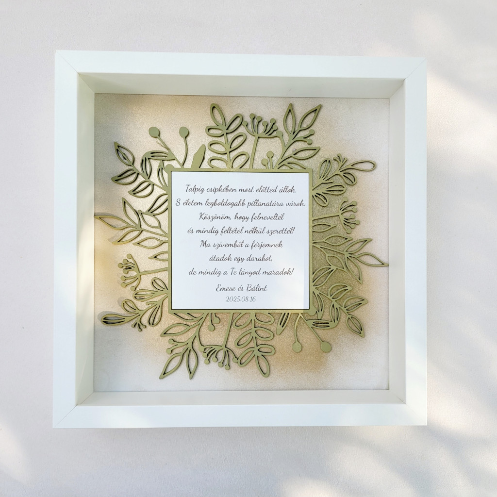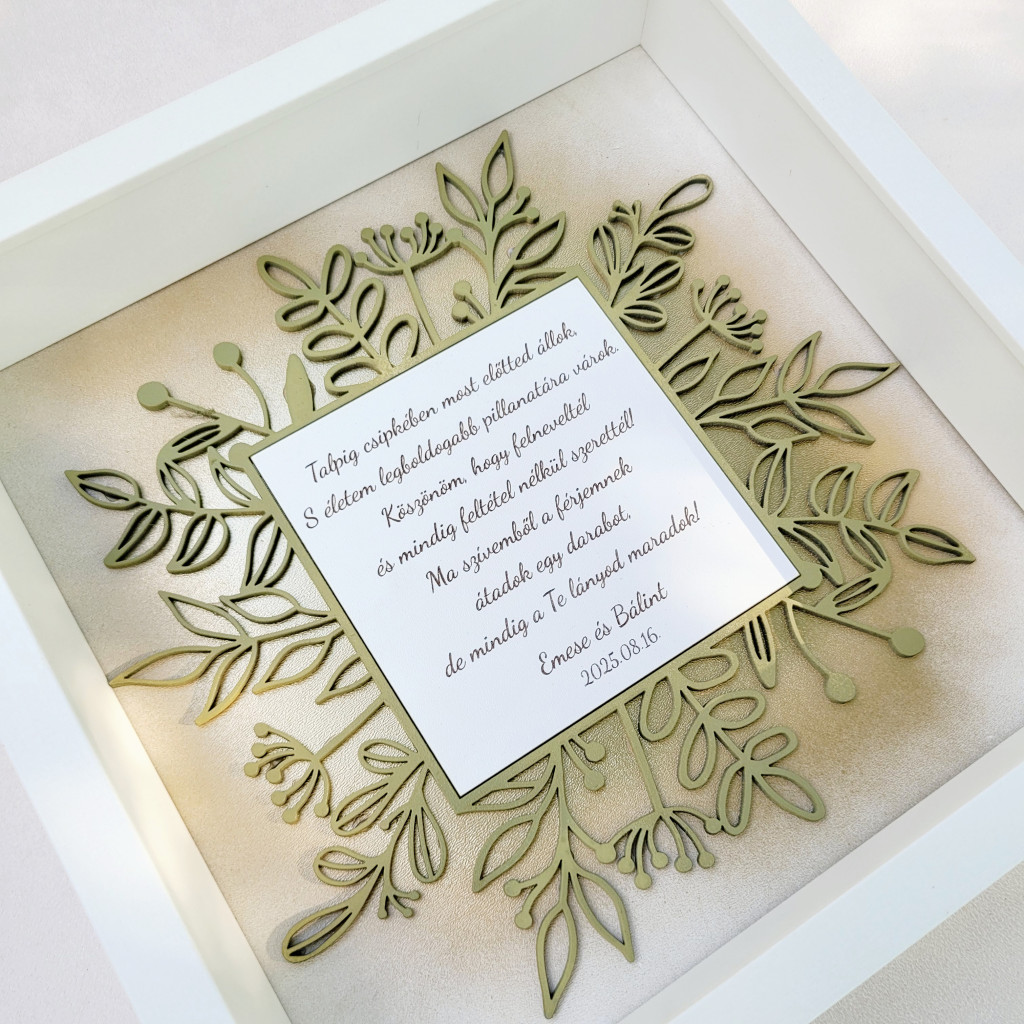 A keret szélessége 25x25 cm, vastagsága 6 cm. A festett fa növényminta közepén a gravírozott szöveg 11x11 cm-es helyet foglal.