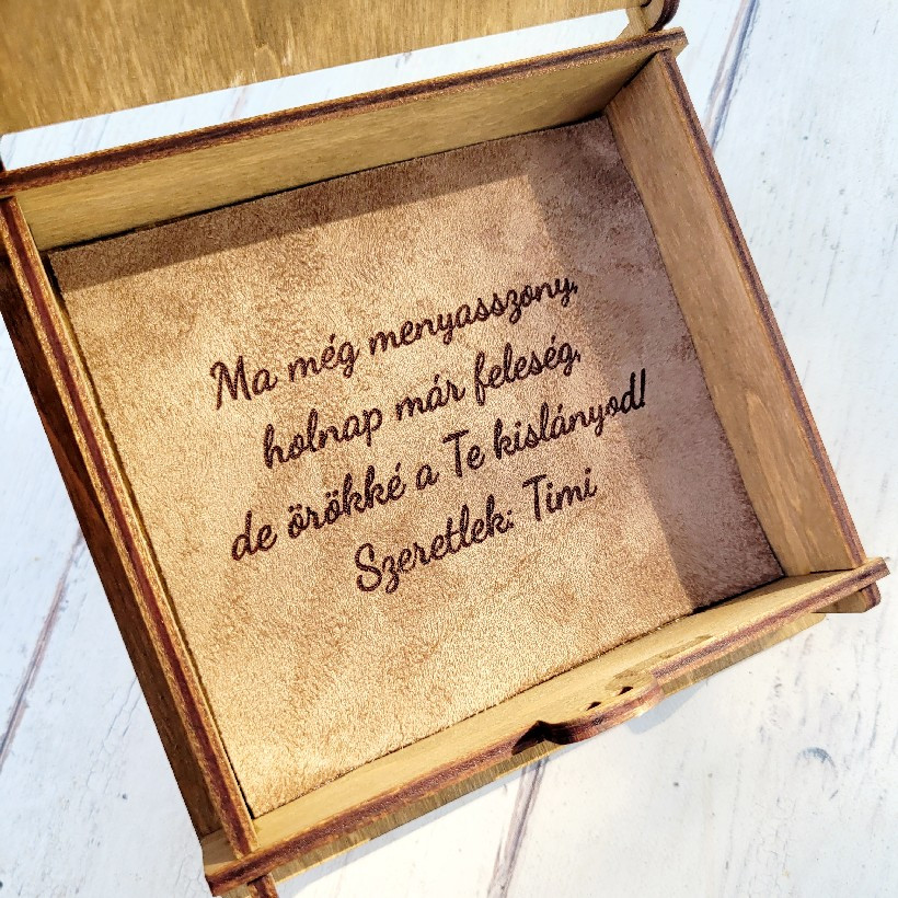 - szintén a megjegyzésbe egy hosszabb szöveget is megadhatsz, ami a doboz alján lévő bársonyos textil anyagra kerül majd