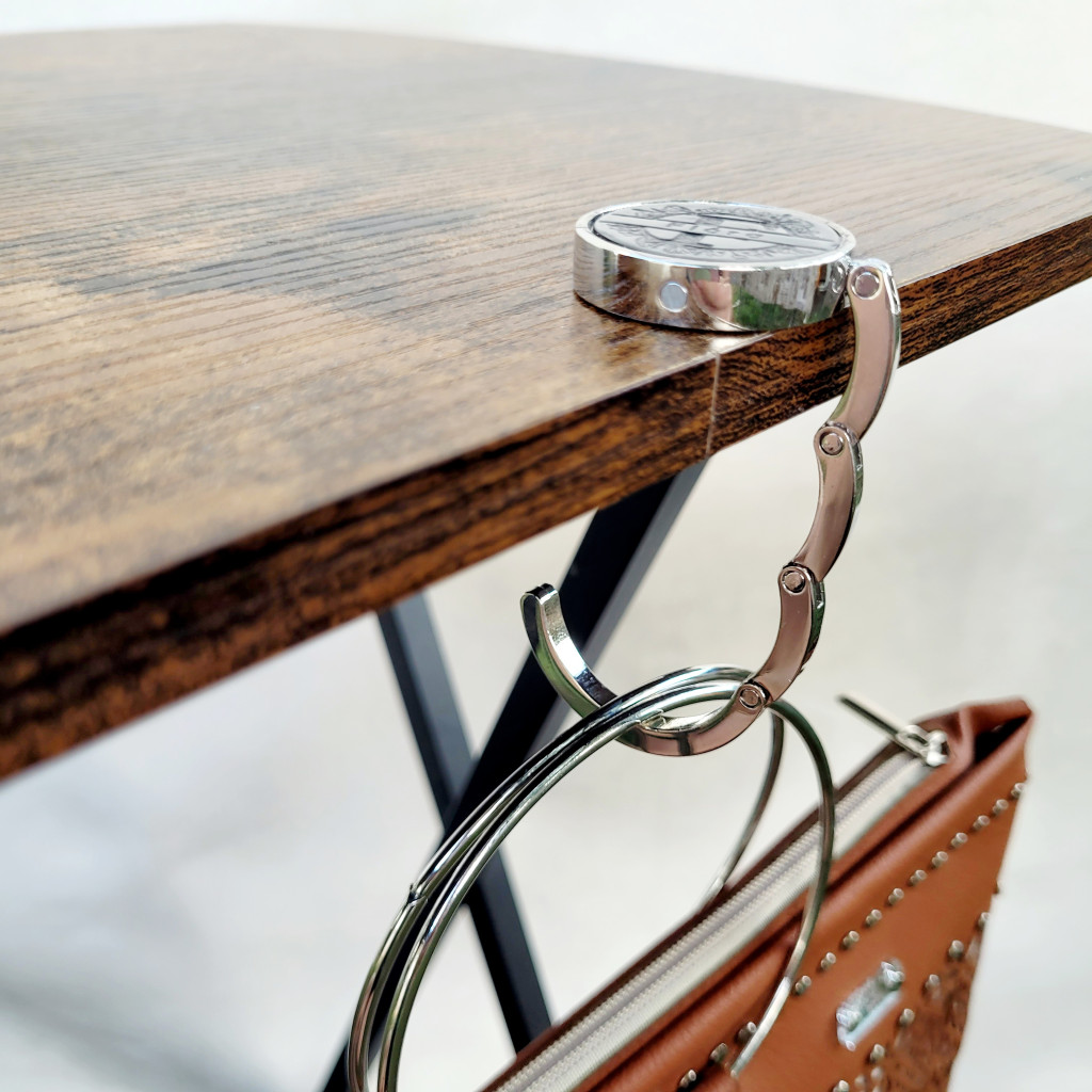 Egyszerűen kinyitható és az asztal lapjára helyezhető akasztóval kényelmesen magad mellett tarthatod a táskád.