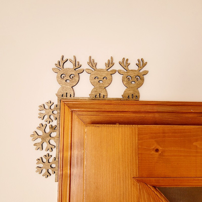 Fából készült dekoráció rénszarvasokkal, ami az ajtófélfa jobb- és baloldalára is helyezhető.